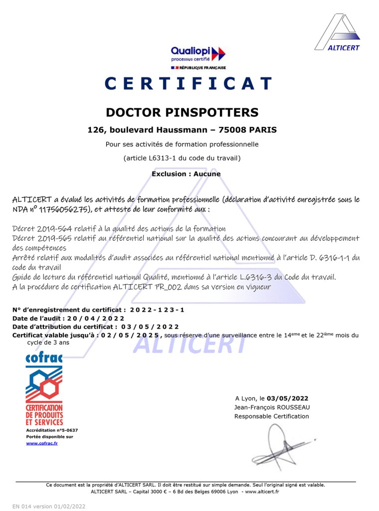 Doctor Pinspotters est un centre de formation enregistré sous le numéro 11756056275 auprès du préfet de région d’Ile-de-France et Datadocké.